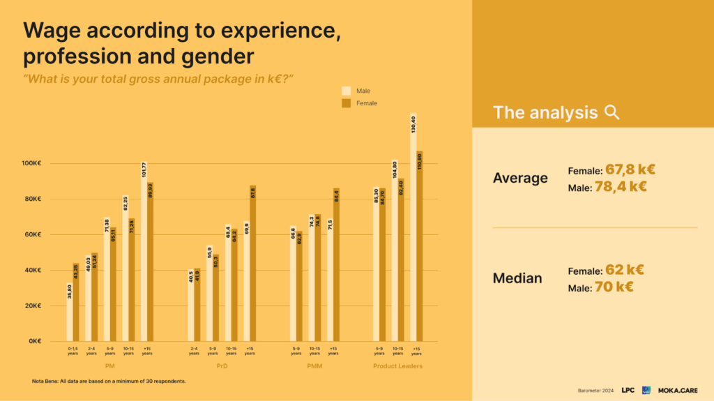 Le produit a beau être une discipline relativement nouvelle, les hommes y sont malgré tout encore mieux payés que les femmes : 65K € de salaire médian contre 60K € (73K € vs 65K € si on regarde la moyenne). C’est d’ailleurs l’une des principales raisons d’être de cette étude : lever le voile sur un sujet tabou et loin d’être transparent dans toutes les organisations. Le savoir est un pouvoir.