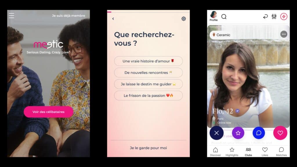 Exemple pour le flow d’onboarding. Sur Match, les utilisateurs doivent répondre à plus de questions, le paywall n’est pas positionné au même emplacement et l’ajout de la photo de profil diffère sensiblement par rapport à ce qui se pratique sur Meetic.
